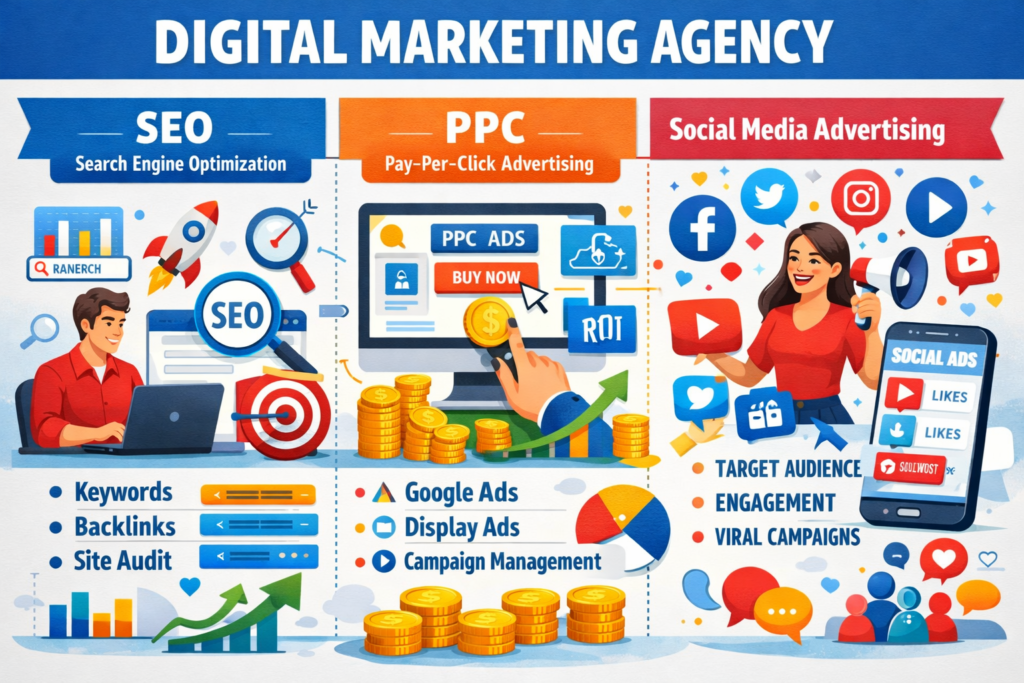 We are a results-driven digital marketing agency dedicated to helping brands grow, connect, and thrive in the digital world. Our team combines creativity, data-driven strategies, and the latest technology to deliver impactful online solutions. From search engine optimization and social media marketing to content creation and paid advertising, we tailor every strategy to meet your unique business goals. We believe in transparency, innovation, and measurable results. By understanding your audience and market, we help turn clicks into customers and ideas into success. Your growth is our mission, and your success defines ours.